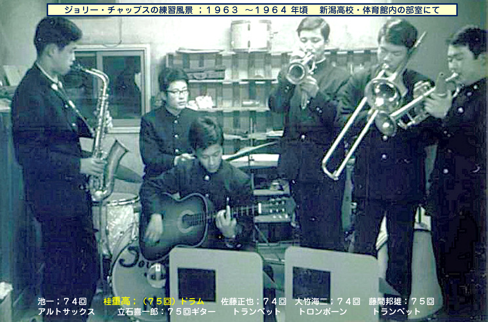 ジョリー・チャップスも曲がり角に来ていました。昭和39年の国民体育大会(国体)が開催された頃で、みんなが楽器を持ち始める頃です。国体といえば開始のファンファーレを誰が吹くかが問題です。(いかにもお役所仕事らしいのですが)それが、実情などを無視して新潟高校に廻ってきた。私が覚えているのは、入学早々、「中学時代に楽器に関係したことのある奴は集まれ」とばかりに人集めがなされ、毎週、新装なった陸上競技場で東京から芸大の先生(?)を呼んで練習したことでした。中校舎の階段下に楽器蔵が作られ、そこに楽器は納められましたが、(たぶん、幹事役を押し付けられた)現代国語の岩野先生がおろおろするばかりで、結局は中学、高校の吹奏楽部の選抜メンバーがファンファーレを吹きました。顧問は宮浦中学の吹奏楽部の先生が勤めました。